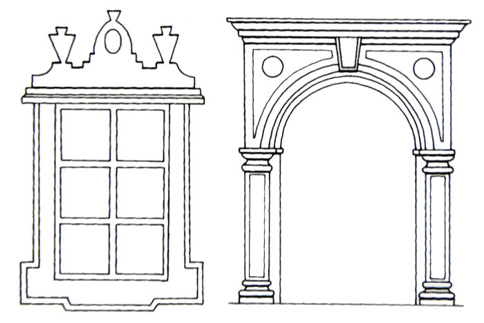 dekorativní orámování otvoru okna nebo vstupu (šambránový portál), provedené v omítce na rozdíl od kamenného ostění